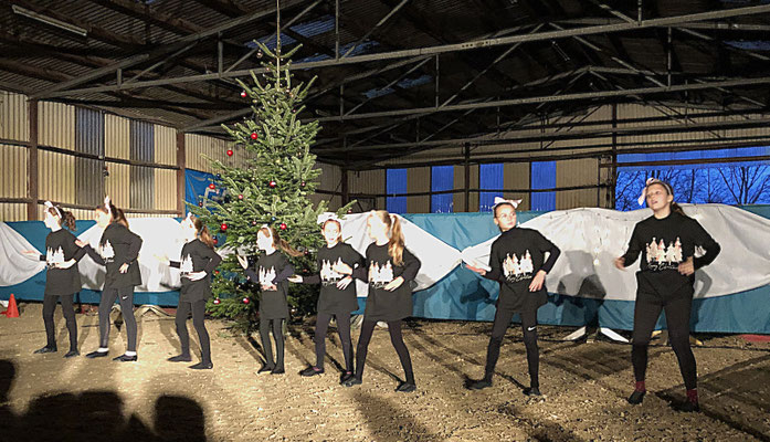 gemeinsam - und fast synchron in ihren, in diesem Kurs bemalten T-Shirts - zeigten eine total coole Tanz-Performance. Übungen auf den verschiedenen Pferden folgten. Danach zeigten immer 2 Voltis